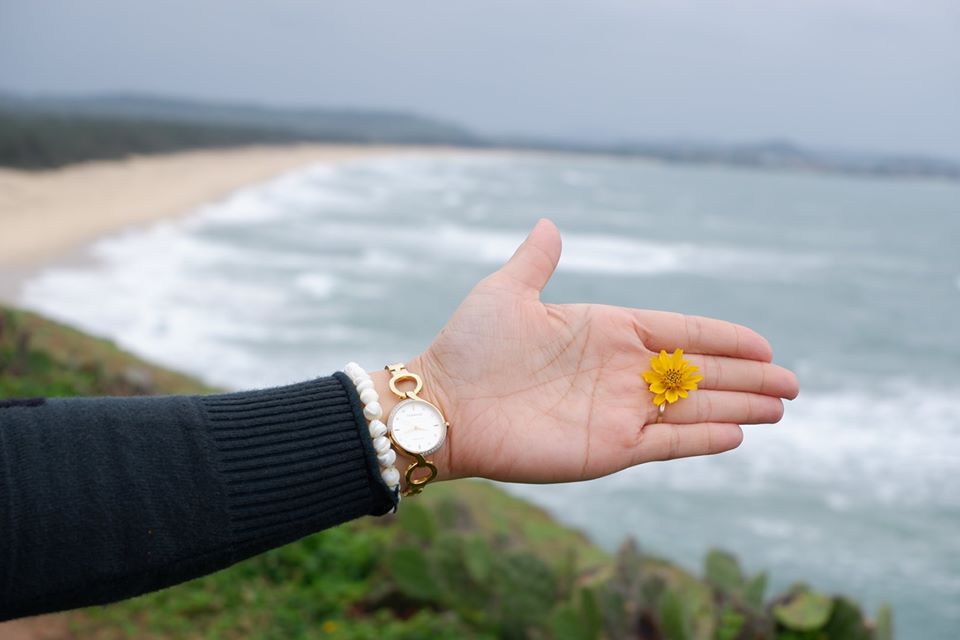 Hôm đó là một ngày giữa đông, miền Trung giữa đông se se lạnh, nước biển không xanh ngắt màu ngọc bích mà xanh lam nhẹ nhàng. Đứng trên gành đá tôi bỗng trở lên khờ dại, có lẽ tôi đã bị vẻ đẹp của núi non biển cả hút hồn, chẳng biết làm gì, chỉ biết cảm nhận, lặng lẽ chọn một chỗ ngồi ngay ngắn hít hà hết hương vị mặn mòi của biển.